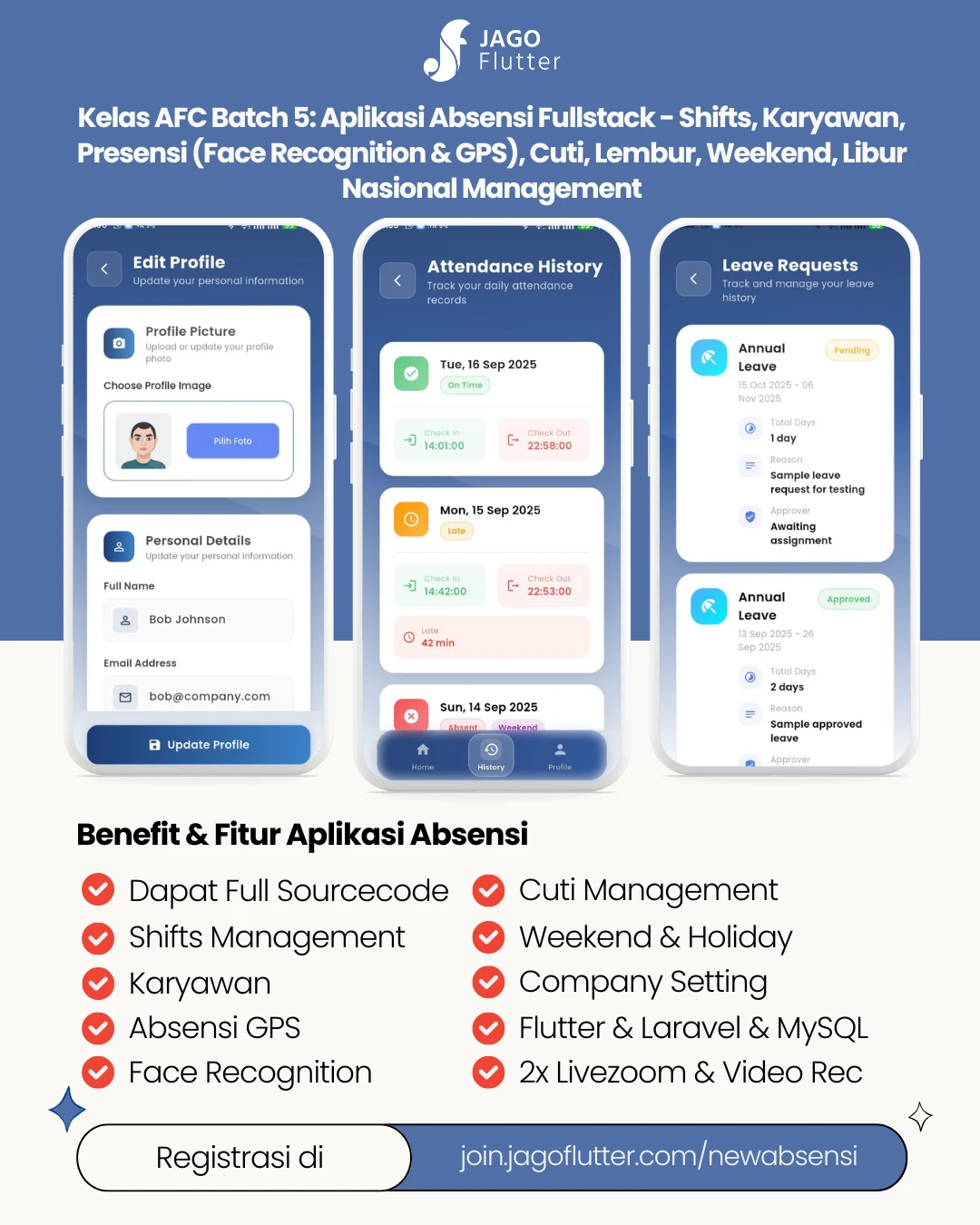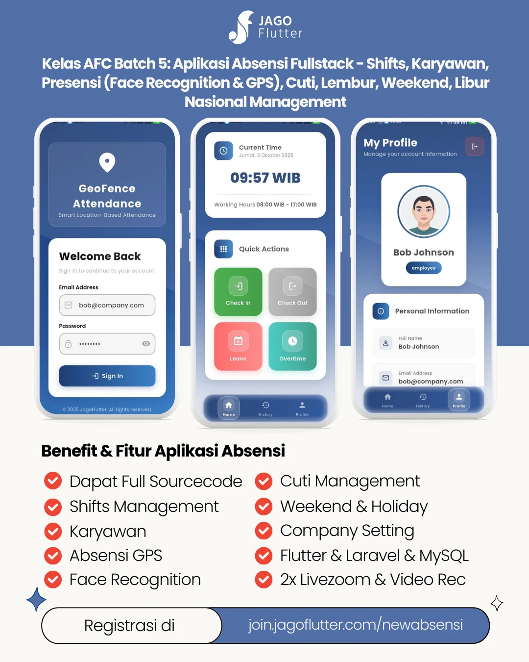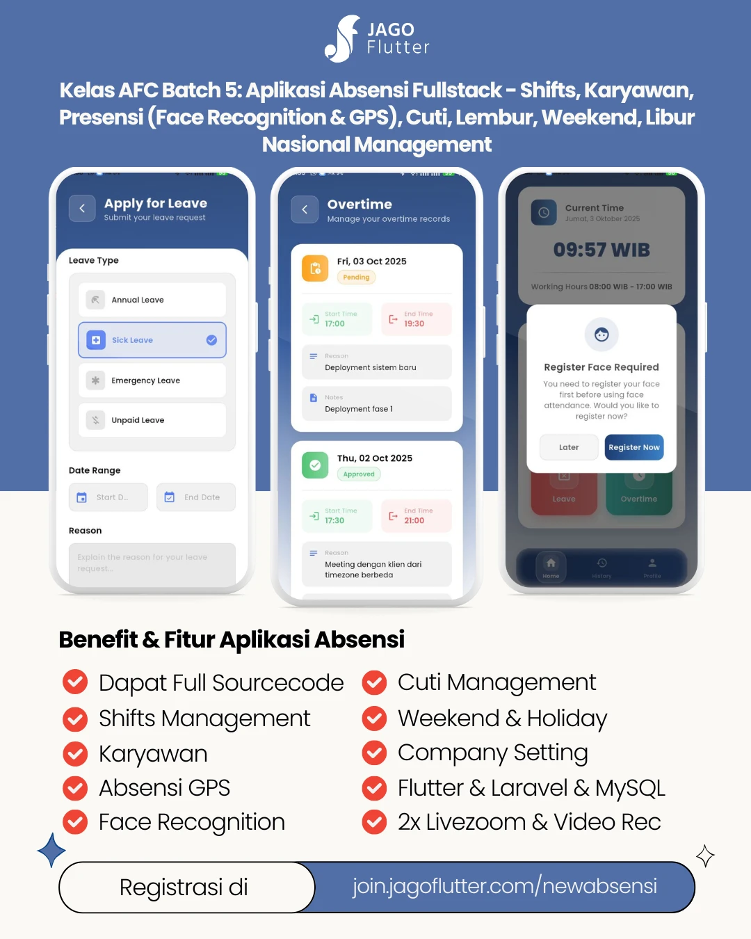 Kelas AFC Batch 5: Aplikasi Absensi Fullstack - Shifts, Karyawan, Presensi (Face Recognition & GPS), Cuti, Lembur, Weekend, Libur Nasional Management